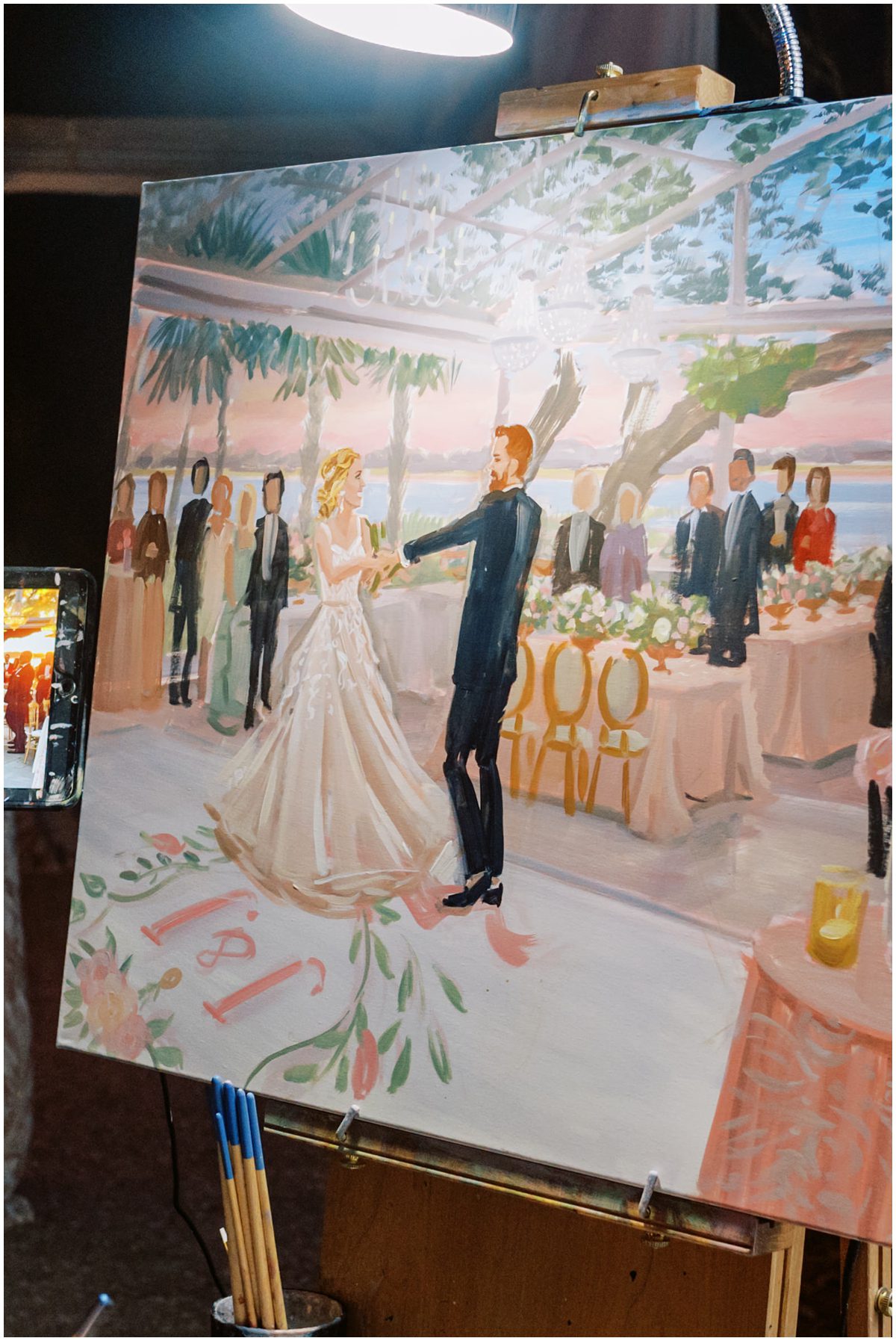 While each artist has their own unique style & offerings, the most popular settings we’ve seen painted are the ceremony, your first dance or a portrait of the two of you with your venue.