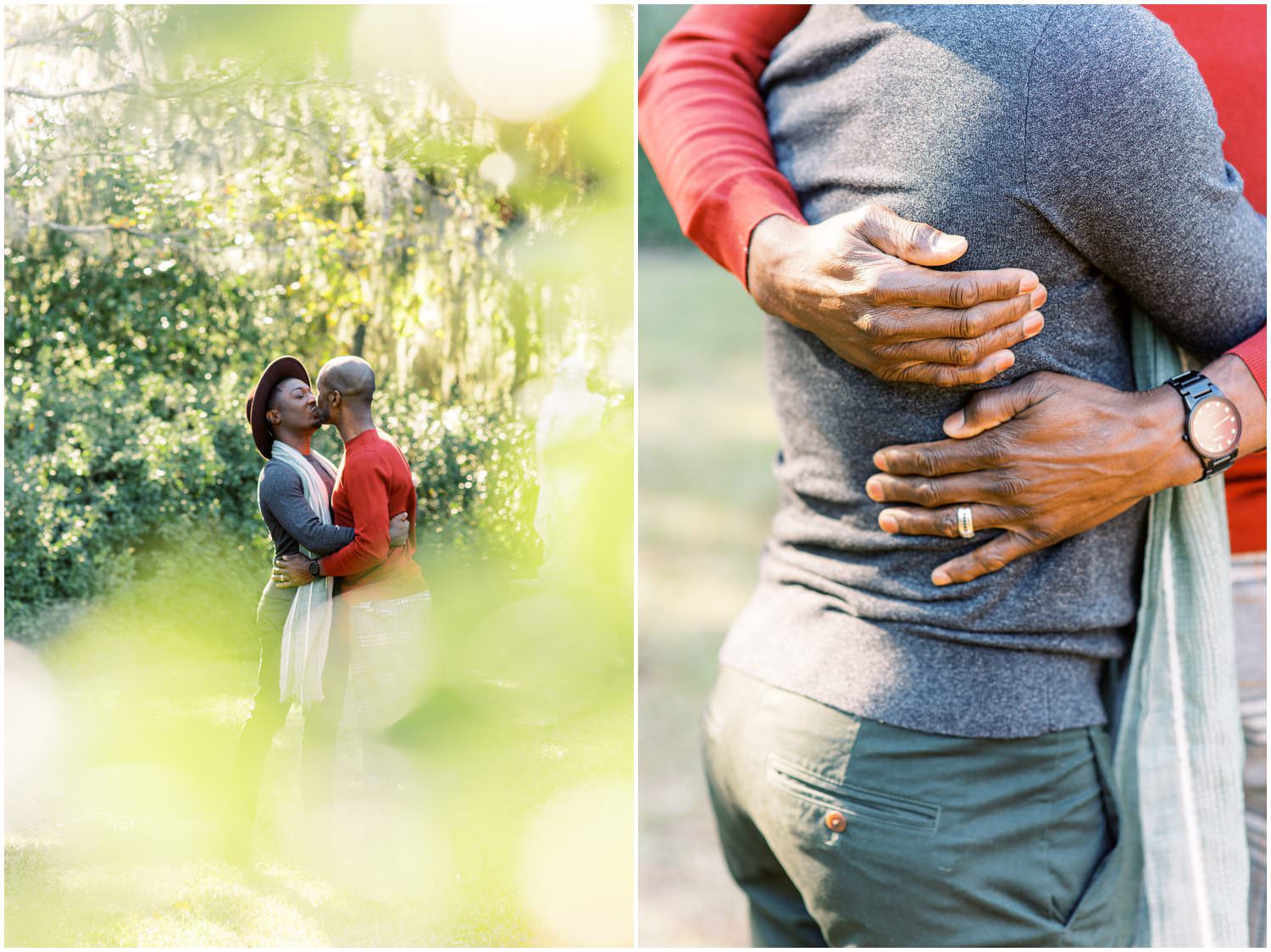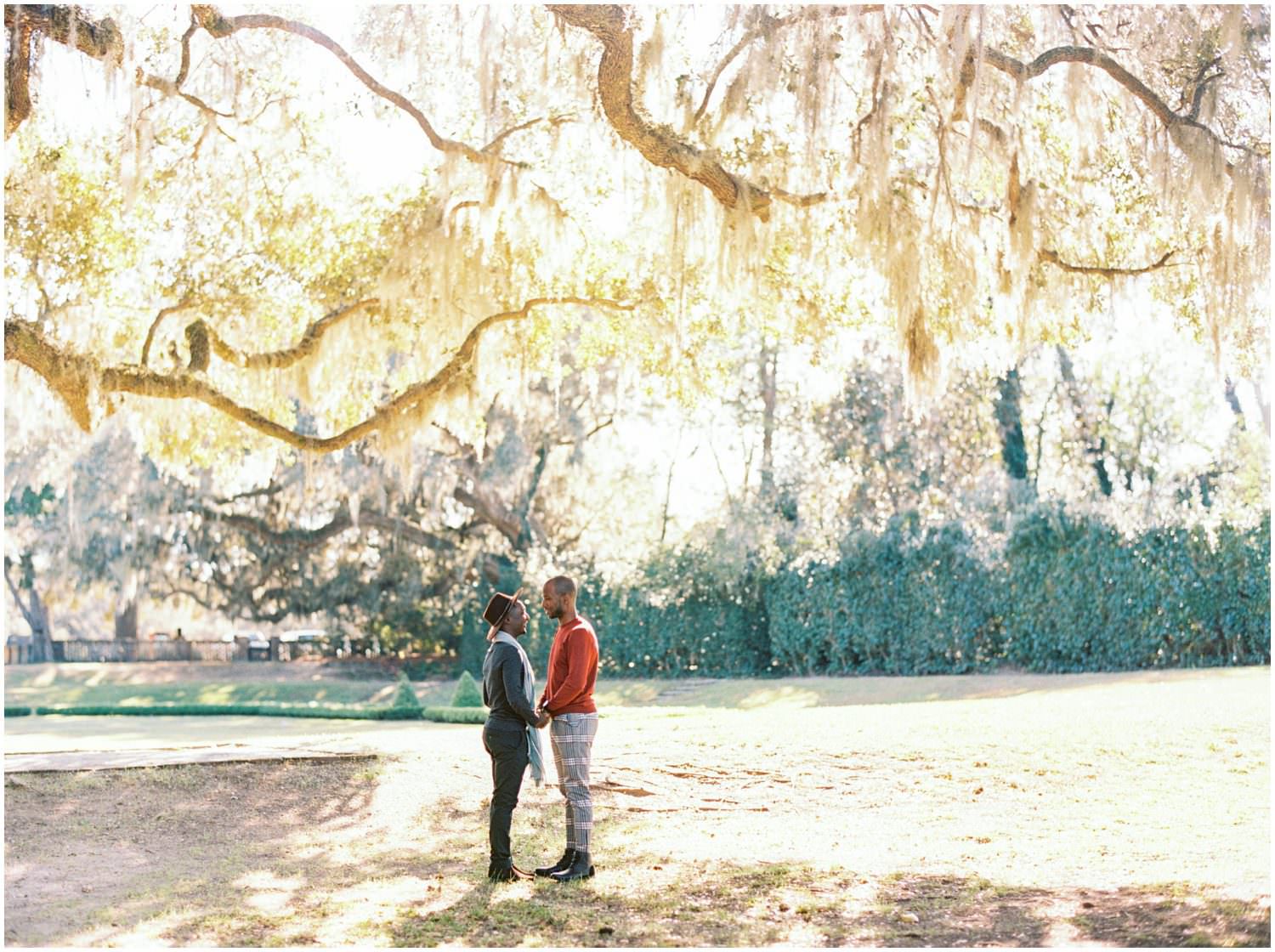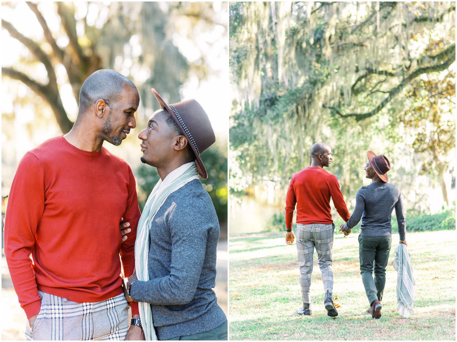 They live in Savannah GA & came up to Charleston for the first time together for their anniversary photos at Middleton Place! Clifton had actually never been to Charleston before. William’s original plan for their photos was to rent a cute Air BnB and have lifestyle “at home” photos but then he emailed me a few weeks before the shoot that he had instead contacted Middleton and set up a shoot there. Of course I gushed about Middleton – we got married there! He even had one of our wedding photos saved as inspiration on his phone and I was like “thats us!!! ^___^”